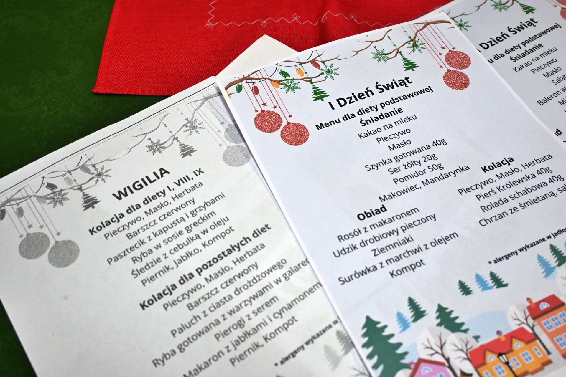 Szpitalne święta nie kończą się na Wigilii. 25 i 26 grudnia to kolejne okazje do świętowania – w menu pojawią się wtedy m.in. bitki schabowe, pieczony udzik drobiowy, rosół z makaronem, zapiekany pasztet, a na deser makowiec, kompot i mandarynki.