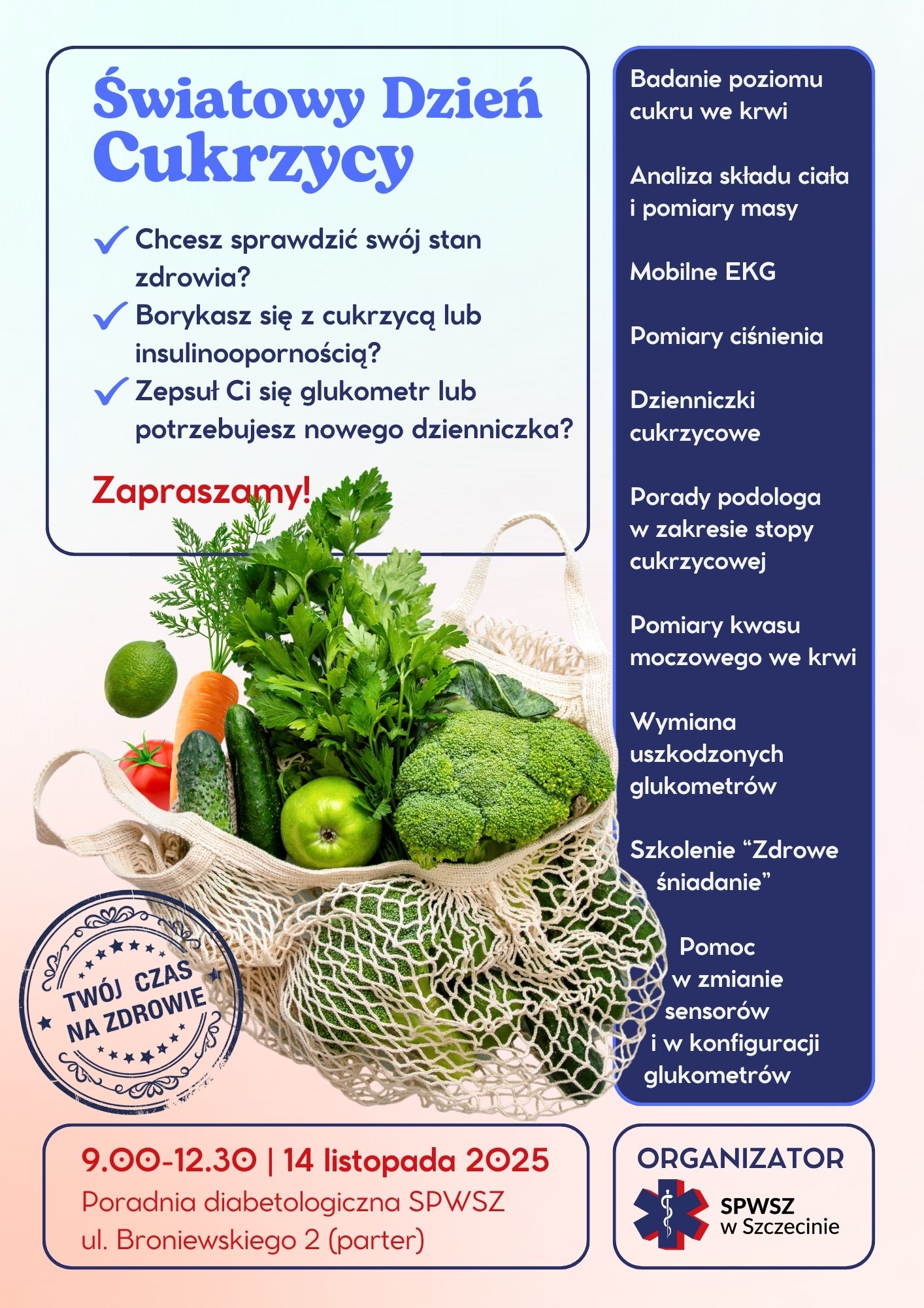 14 listopada 2025 w poradni diabetologicznej SPWSZ przy ul. Broniewskiego 2 (parter) odbędą się bezpłatne badania i konsultacje w ramach obchodów Światowego Dnia Cukrzycy. Sprawdź, co dla Was przygotowaliśmy!